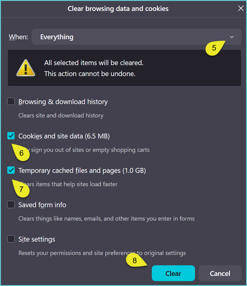 5. In the dialog that appears, set the value for 'When' to 'Everything', select the checkboxes for: 'Cookies and site data' and 'Temporary cached files and pages.'